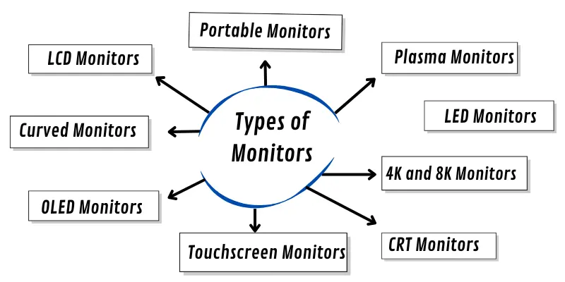 Common types include CRT, LCD, LED, OLED, touchscreen, curved, 4K/8K, and portable monitors. Each type serves different purposes, such as gaming, professional work, or general use.